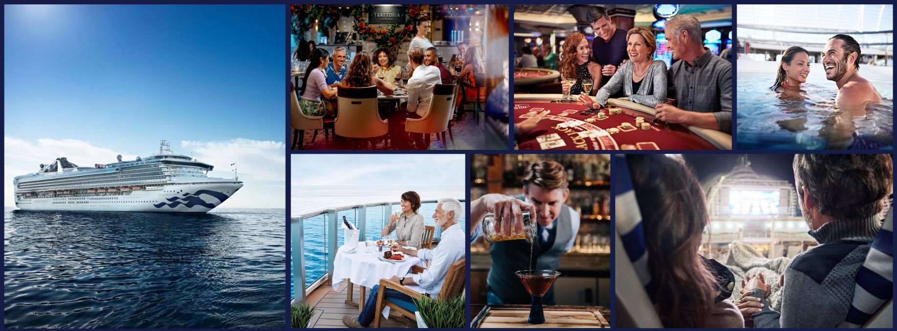The Discovery Princess offers a perfect mix of relaxation, adventure, and entertainment at sea. Guests can enjoy a variety of dining options, from elegant main dining rooms and casual buffets to specialty restaurants like Crown Grill and Sabatini’s, while sipping cocktails in stylish bars and lounges. Days are filled with activities such as pools and hot tubs, fitness classes, trivia, shopping, and peaceful moments in The Sanctuary, while evenings come alive with Broadway-style shows, live music, comedy, movies under the stars, and casino fun, making every moment onboard memorable.