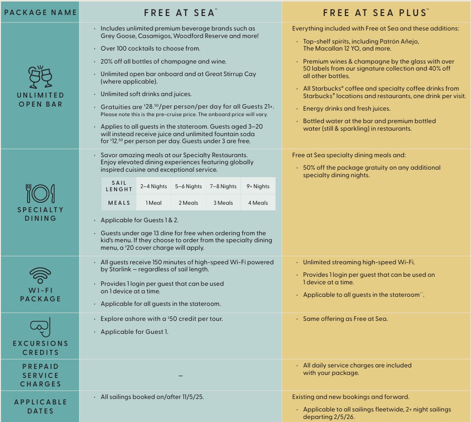 Norwegian’s onboard packages offers a whole ocean of opportunity to both your onboard & onshore experience. Upgrade to Free at Sea Plus™ for just $49.99 per person per day. If you have already purchased pre‑paid gratuities, Free at Sea Plus™ is $34.99 per person per day.