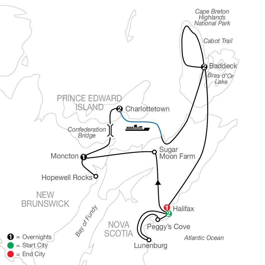 Hello, coastal Canada! This tour of the Canadian Maritimes and Cape Breton Island has cooked up plenty of unique experiences in this picturesque part of the world. Get your camera ready for Canada’s most photographed lighthouse in Peggy’s Cove, your windbreaker zipped for the highest and wildest tides at Hopewell Rocks, and your taste buds ready for a traditional Maritimes breakfast, sugar camp lunch, and fresh lobster dinner. Visit the world of a red-headed girl in a straw hat and braids to meet one of Canada’s most loved fictional characters, Anne of Green Gables. Throughout Nova Scotia, New Brunswick, and Prince Edward Island, tiny fishing villages, giant whales, and the grandest of scenery will be calling your name, as will Cape Breton’s historic Alexander Graham Bell Museum. PLUS, your tour includes your choice of excursions in Halifax so you can plan your day your way.