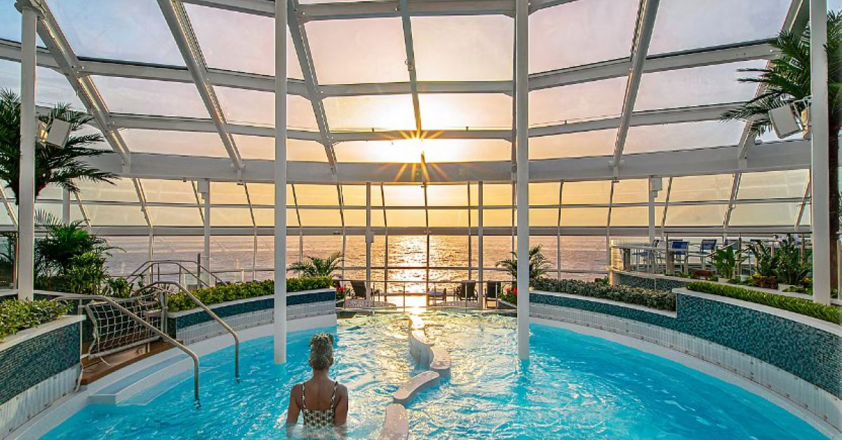 Discover the Solarium, a relaxing indoor-outdoor retreat just for our adult guests. Perfectly positioned at the front of every Royal Caribbean® ship, the crystal canopy area presents fantastic views and stays warm while you enjoy swimming pools, whirlpools and lounge area, as well as cascading lagoons on select ships.