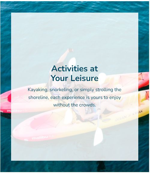 • Adventure for all ages with kayaking, snorkeling, and water sports.
