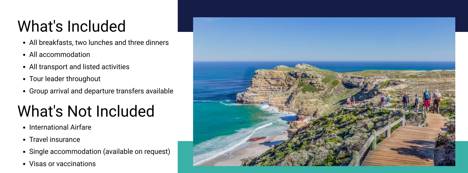 Join your tour leader for a thrilling day exploring the best of the Cape Peninsula. We start at Boulders Beach, where we spend time gazing over the protected rookery of African penguins. Next, we head to Cape Point Nature Reserve, keeping an eye out for eland and red hartebeest, before taking the Flying Dutchman funicular through dense fynbos to the upper lighthouse for panoramic views over the Cape of Good Hope, the iconic Diaz Beach, coastal cliffs and endless sea.