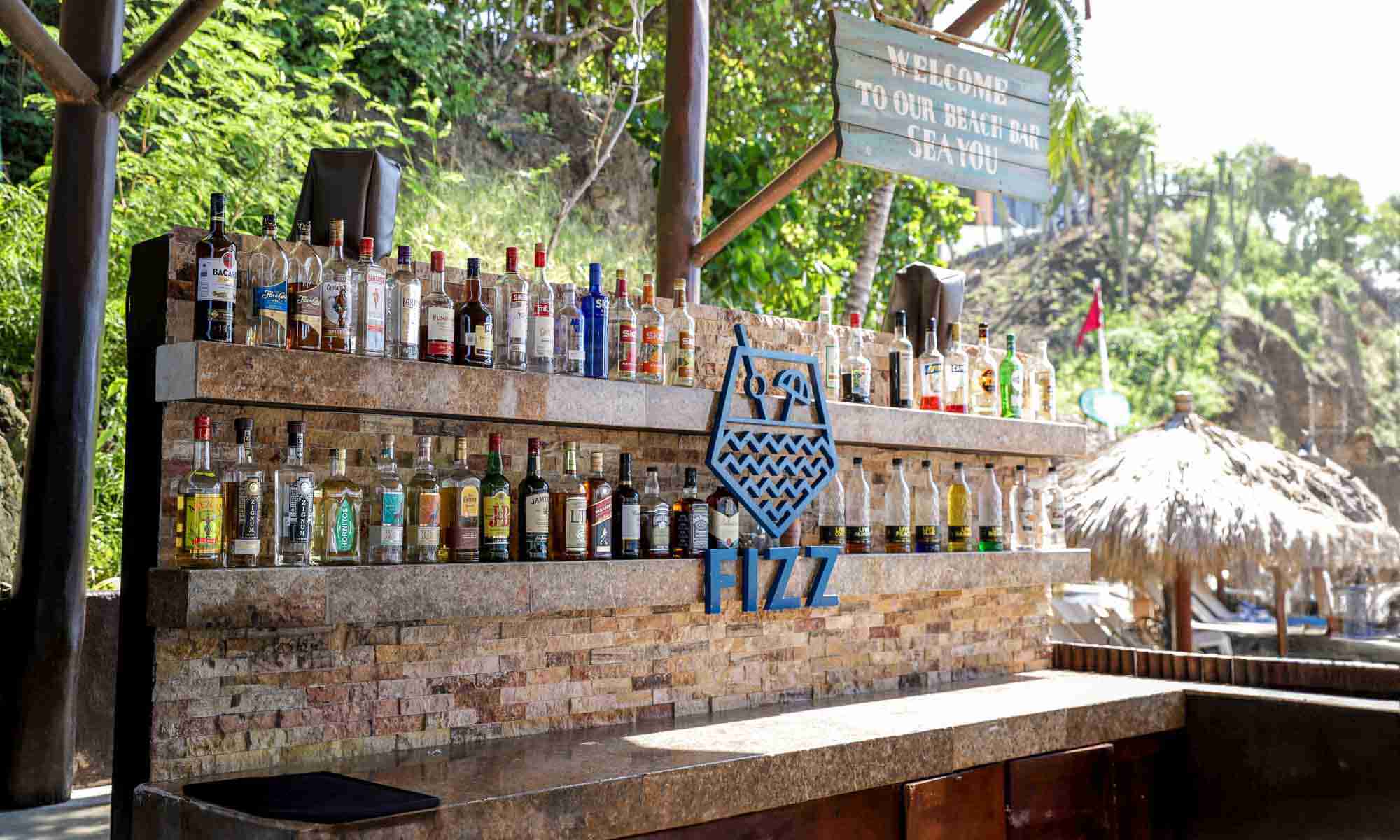 Rustic stone bar serving a wide range of classic and signature cocktails as well as ice-cold draft beer, all directly on the sand.