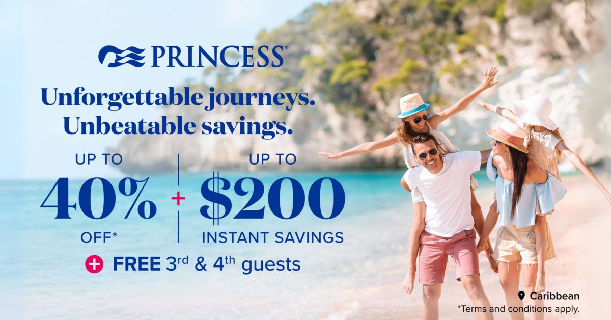 For a limited time, get up to 40% off and up to $200 instant savings on a Princess cruise. And if you’re bringing the whole crew, we’ve got you covered with FREE 3rd & 4th guests on select sailings. Don’t leave anyone behind — book now before this offer ends!