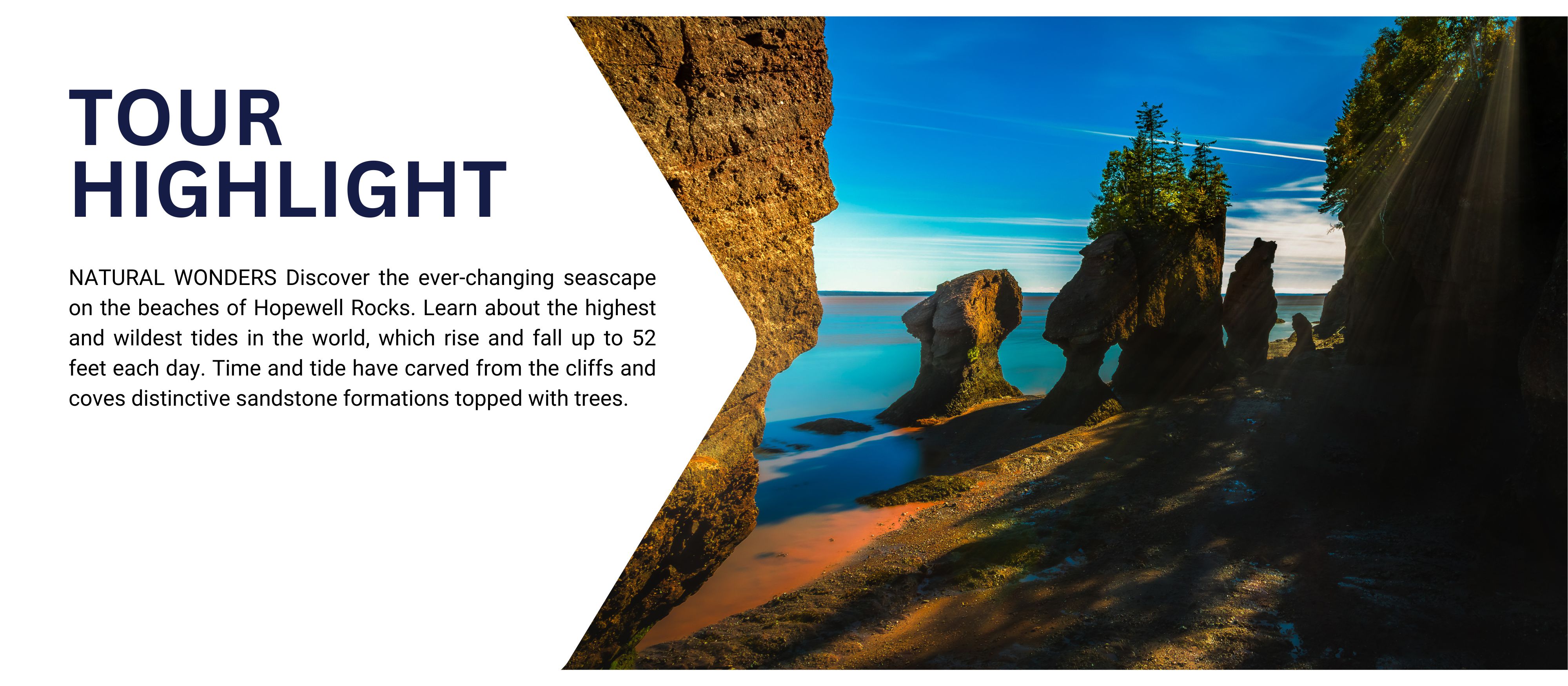 Hello, coastal Canada! This tour of the Canadian Maritimes and Cape Breton Island has cooked up plenty of unique experiences in this picturesque part of the world. Get your camera ready for Canada’s most photographed lighthouse in Peggy’s Cove, your windbreaker zipped for the highest and wildest tides at Hopewell Rocks, and your taste buds ready for a traditional Maritimes breakfast, sugar camp lunch, and fresh lobster dinner. Visit the world of a red-headed girl in a straw hat and braids to meet one of Canada’s most loved fictional characters, Anne of Green Gables. Throughout Nova Scotia, New Brunswick, and Prince Edward Island, tiny fishing villages, giant whales, and the grandest of scenery will be calling your name, as will Cape Breton’s historic Alexander Graham Bell Museum. PLUS, your tour includes your choice of excursions in Halifax so you can plan your day your way.